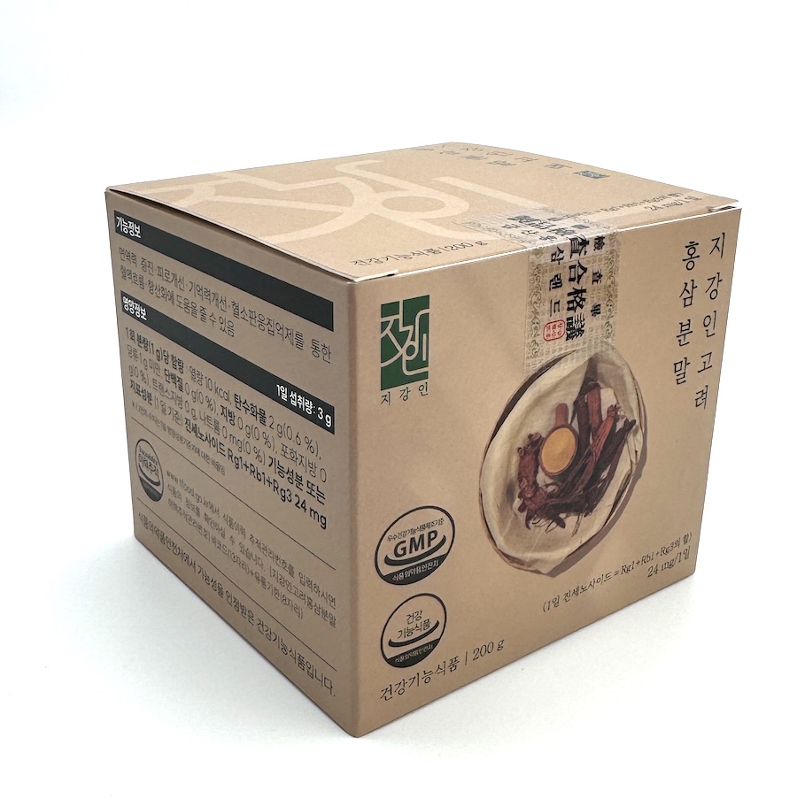 Panax ginseng C.A.Meyer, 6letý, prášek, ze 70% hlavního kořene a 30% koncových kořínků, obsah ginsenosidů na 1g je 8 mg, 10 kcal na 1 gram, obsah sacharidů max 0,6%, bez bílkovin, soli, cukru a sodíku, bez tuků. Renomovaný korejský producent GRG. Certifikace ISO9001 (9000) a ISO14001. V balení dávkovací lžičky: na 0,58 g a 1 g. Na krabičce vidíte obsah ginsenosidů 24 mg, jde však o údaj ke korejské denní dávce - ta činí 3 gramy, což není v EU povoleno - Evropská komise nám dovoluje pouze 2 gramy ženšenu denně 🙄!