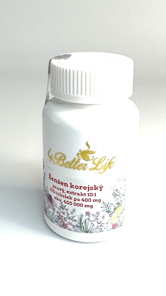 Panax Gingseng – všehoj – pravý korejský ženšen, extrakt 10:1 - veganské (HPMC) tobolky (pro variantu 400 g tobolky velikosti "0", pro variantu 250 g tobolky velikosti "1"), 100 ks á 400 miligramů (nebo levnější 250 mg). Cenově zvýhodněná varianta, balení - dóza plast 100 ml. Balení obsahuje 40 g (resp. 25 g) extraku 1:10 korejského ženšene (tj. z 10 kg kořene bylo vyrobeno exktrakcí 1000 gramů ektraktu.