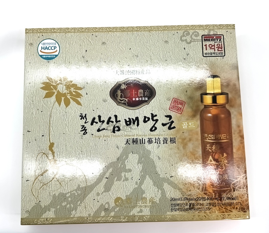 Extrakt z kultivovaného divokého (horského) korejského ženšenu, 20 lahviček po 20 ml, dárkově baleno, certifikát kvality, nálev bez alkoholu, s příměsi extraktů z grepových jadérek, reishi, červeného ženšenu, pohanky. 100 g produktu obsahuje 1,8 % cukru, 0,5 % bílkovin, 0,1 % tuků, 0,8 % solí.