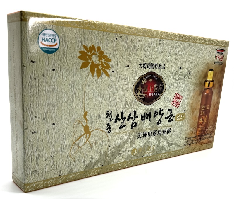 Jedinečný produkt doma (u mistra ženšenu) kultivovaný divoký (horský) korejský ženšen, několikaměsíční výluh v horské vodě, kazeta obsahuje 10 lahviček s kořínky ženšenu a 20 ml nálevu.