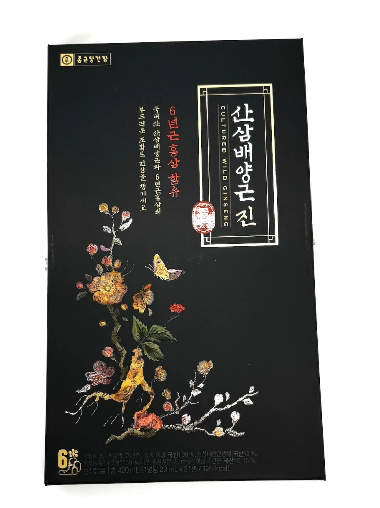Jedinečný produkt doma (u mistra ženšenu) kultivovaný divoký (horský) korejský ženšen, několikaměsíční výluh v horské vodě, kazeta obsahuje 21 lahviček s kořínky ženšenu a 20 ml nálevu.