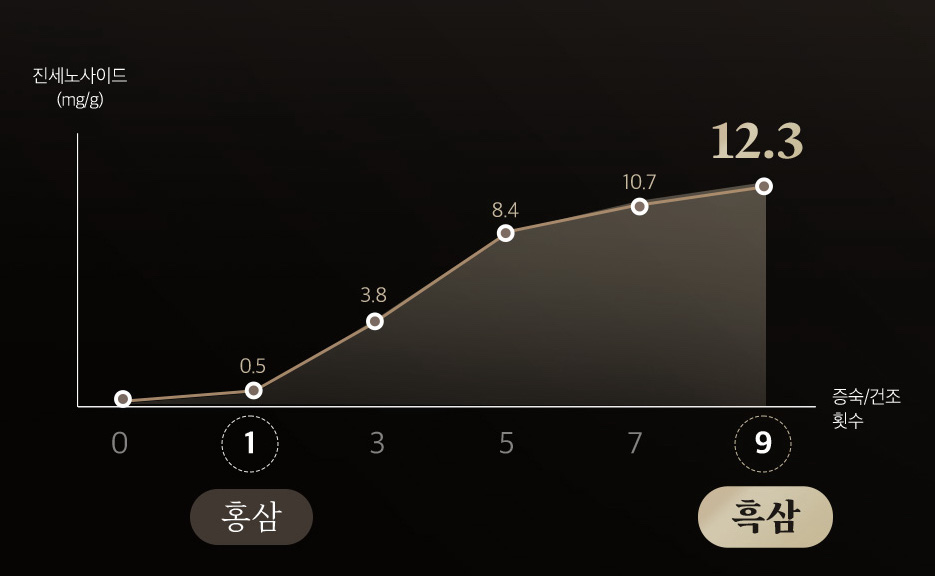 240 g extraktu - odvaru 6letého korejského černého ženšenu v láhvi. Jde o jeden z nejvzácnějším extraktů na korejském trhu. Černý ženšen je vyráběn jen několika málo výrobci, roste ve velmi kvalitním prostředí. Proces výroby je poměrně složitý a časově náročný - trvá 1 rok. Extrakty z černého korejského ženšene jsou velmi vzácné i na korejském trhu. Až 9 x sušeno a napařováno a fermentováno - opakovaným napařováním dochází k fermentaci, během níž se tvoří další vzácné účinné látky. Proces sušení: 9 (viz obr. níže). Takto fermentované černé kořeny jsou pak 72 vařeny při nízké teplotě a následně ještě 24 hodin fermentováno. Zcela bez cukru. Pro vyvážení chuti a účinků přidány (pod 3% obsahu) tradiční přísady korejských extraktů jako extrakty reishi, pelyněku, jojoby, zázvoru, zvonku.
