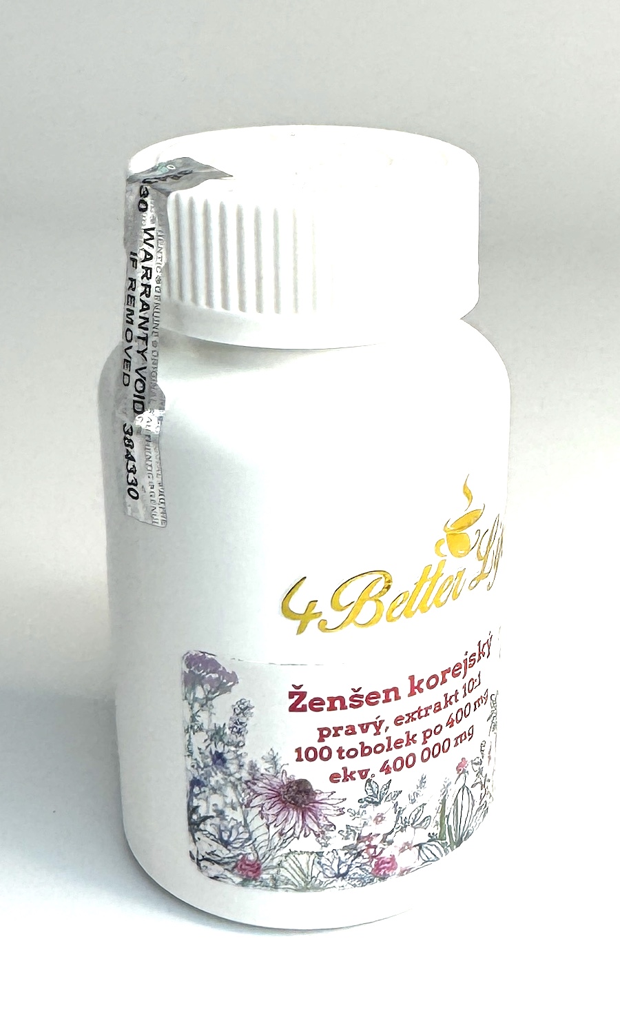 Panax Gingseng – všehoj – pravý korejský ženšen, extrakt 10:1 - veganské (HPMC) tobolky (pro variantu 400 g tobolky velikosti "0", pro variantu 250 g tobolky velikosti "1"), 100 ks á 400 miligramů (nebo levnější 250 mg). Cenově zvýhodněná varianta, balení - dóza plast 100 ml. Balení obsahuje 40 g (resp. 25 g) extraku 1:10 korejského ženšene (tj. z 10 kg kořene bylo vyrobeno exktrakcí 1000 gramů ektraktu.